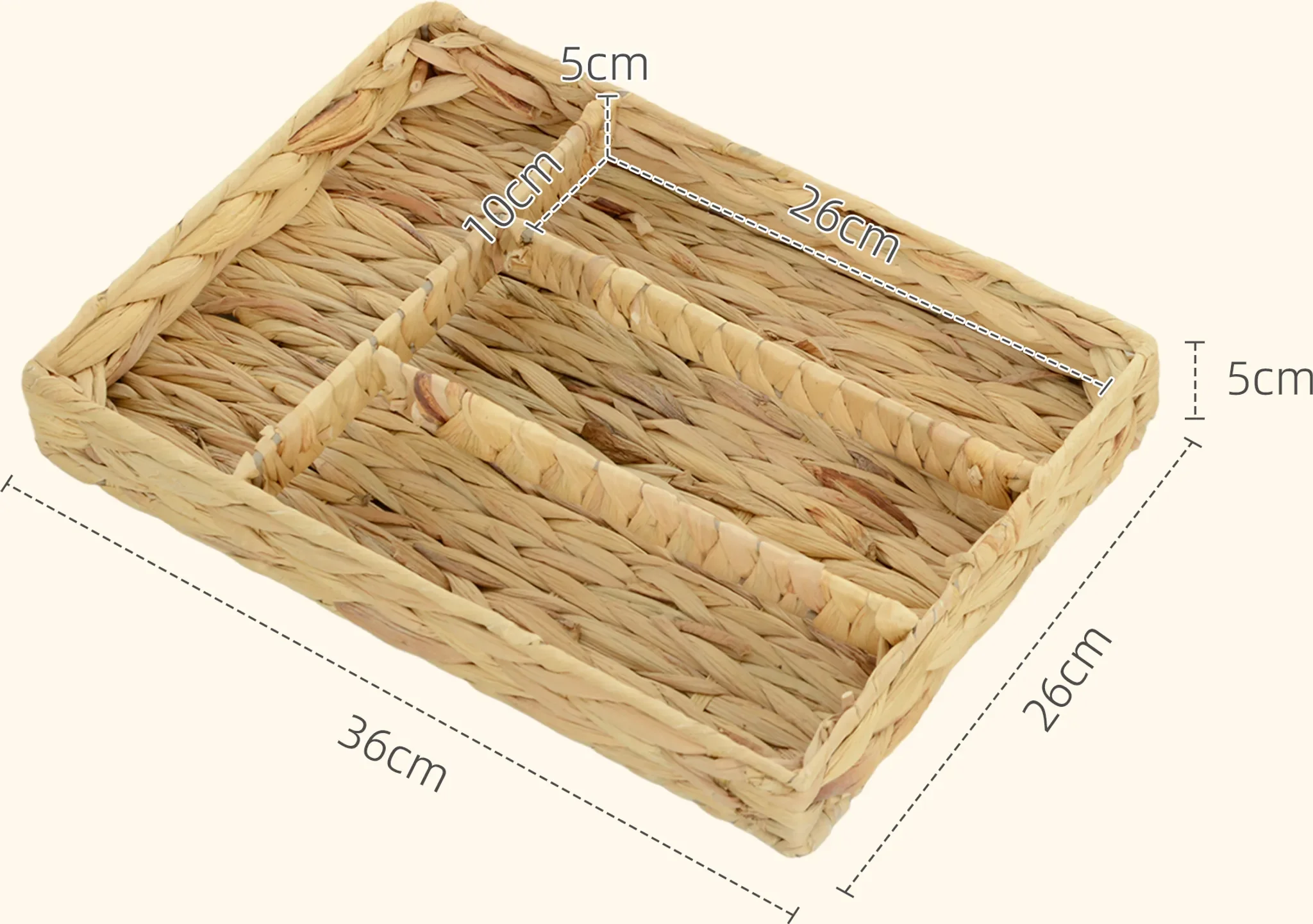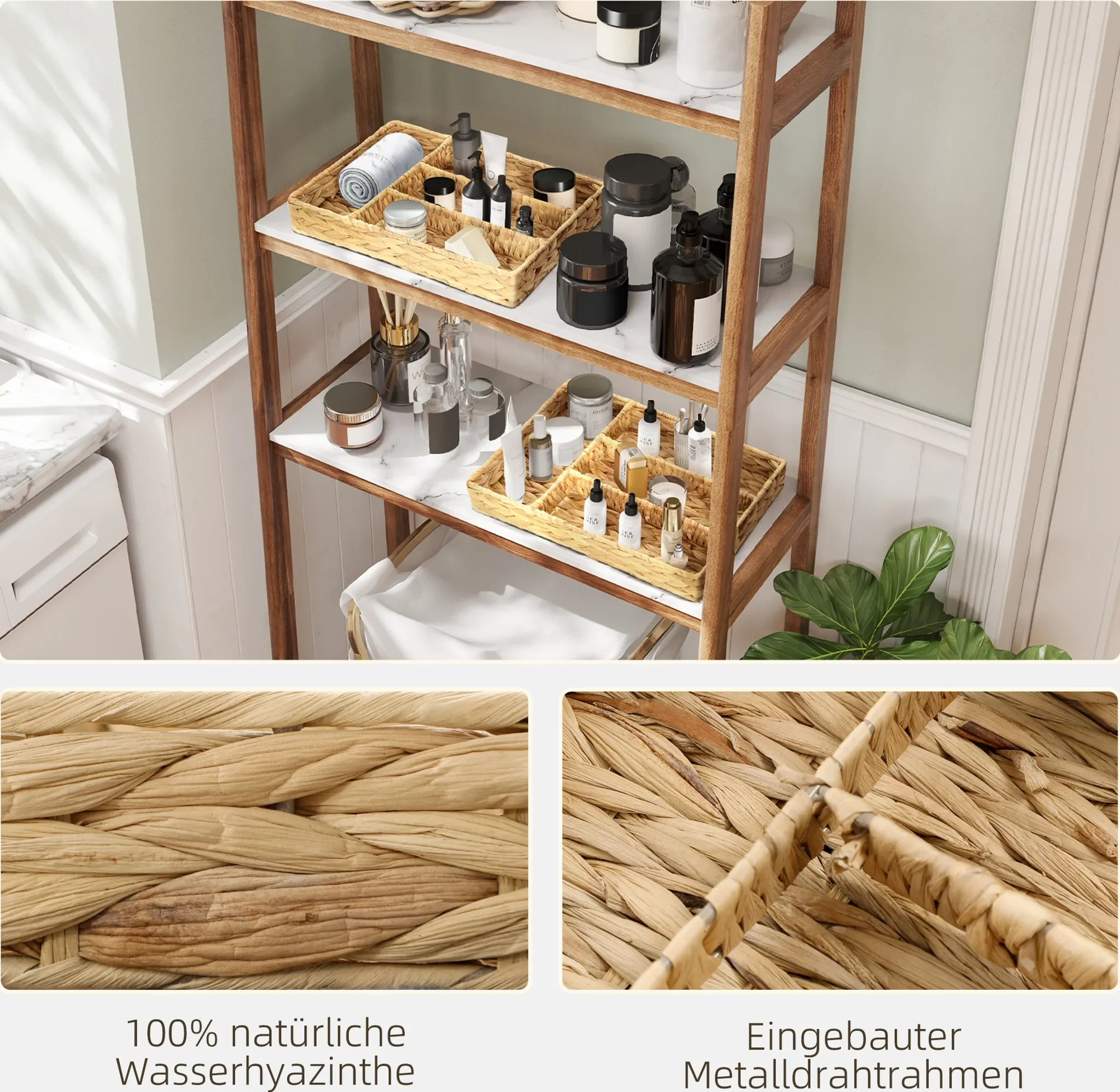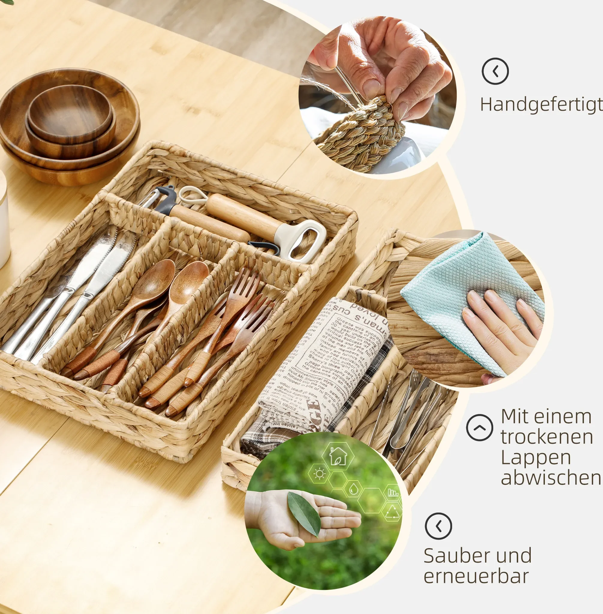 Highlights: Handgeflochtenes Naturmaterial, stabile Metallverstärkung, vier praktische Fächer, sofort einsatzbereit ohne Montage, dekorativ und funktional zugleich.