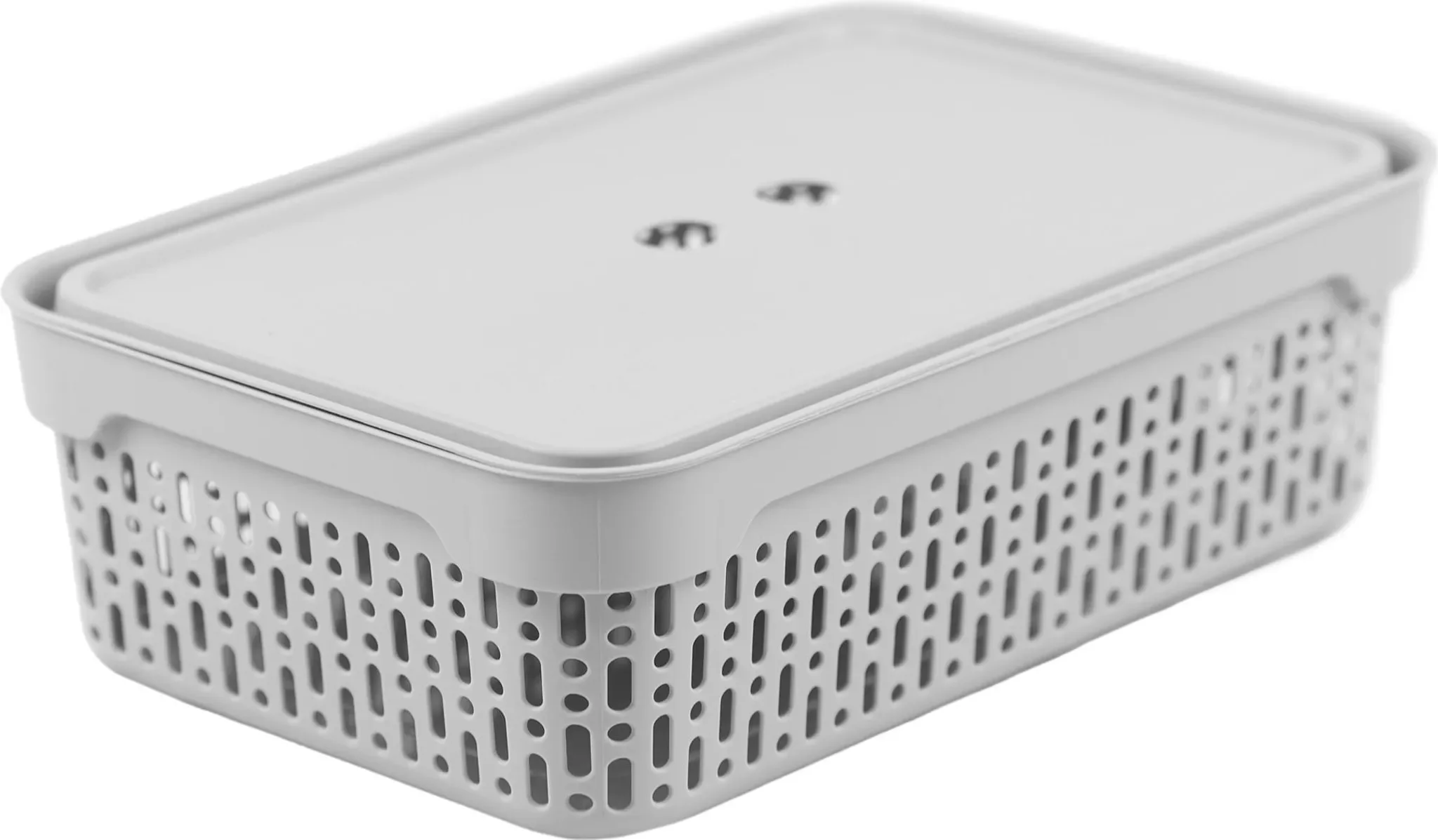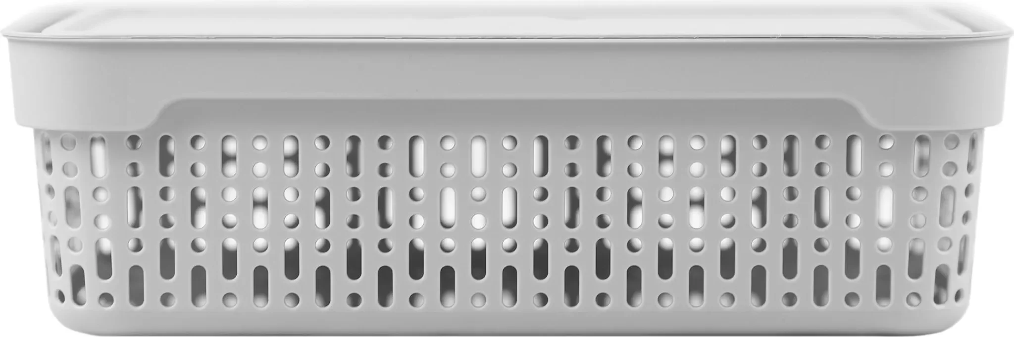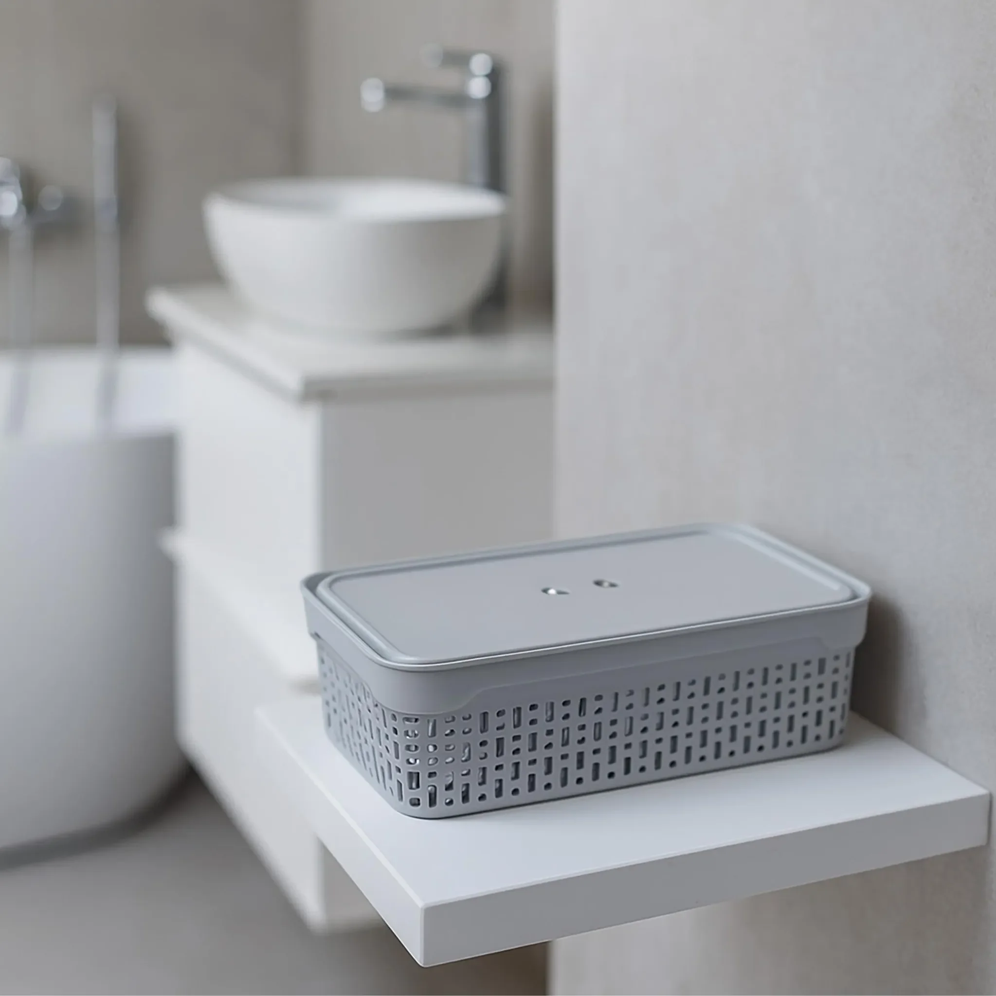 Die perforierten Seitenwände sorgen für eine gute Luftzirkulation und eignen sich ideal zur Aufbewahrung von Kosmetikartikeln, Hygienezubehör oder Textilien. Der mitgelieferte Deckel schützt den Inhalt vor Staub und Schmutz, während seitliche Öffnungen das Tragen und Herausnehmen erleichtern.