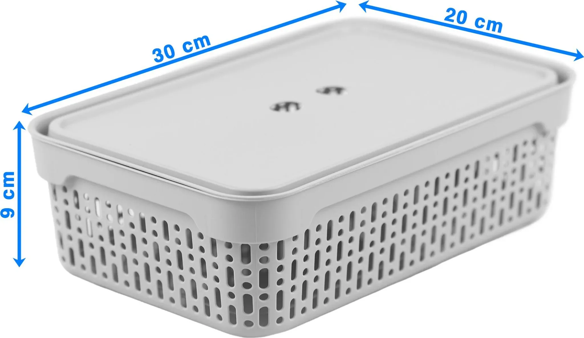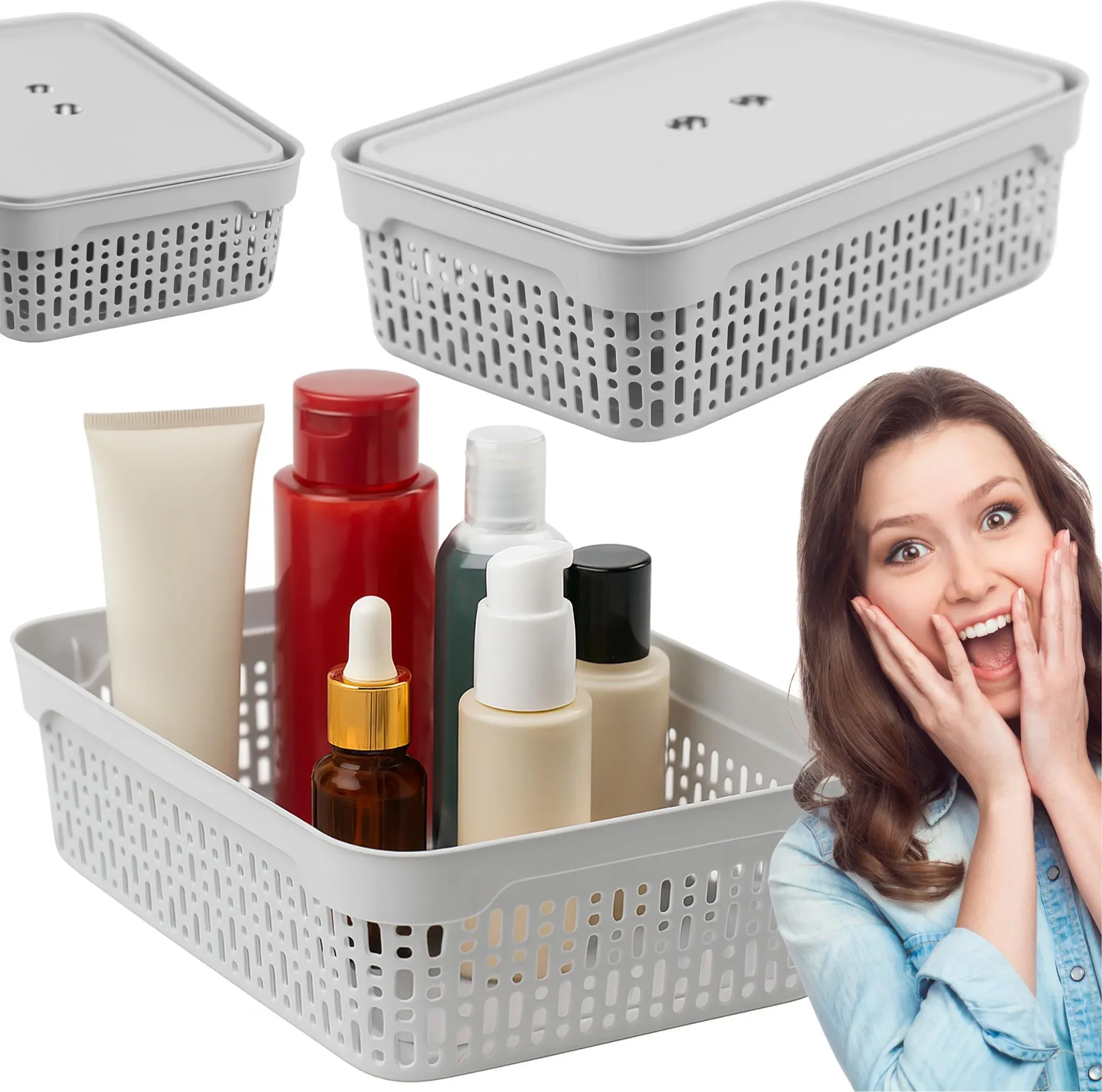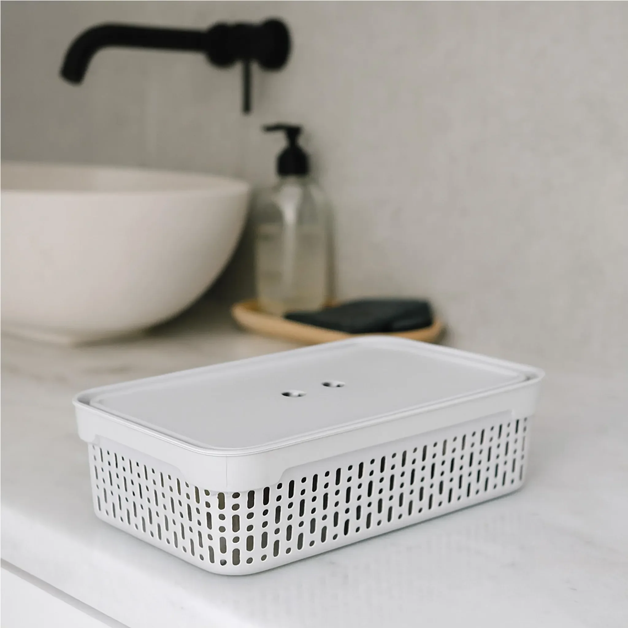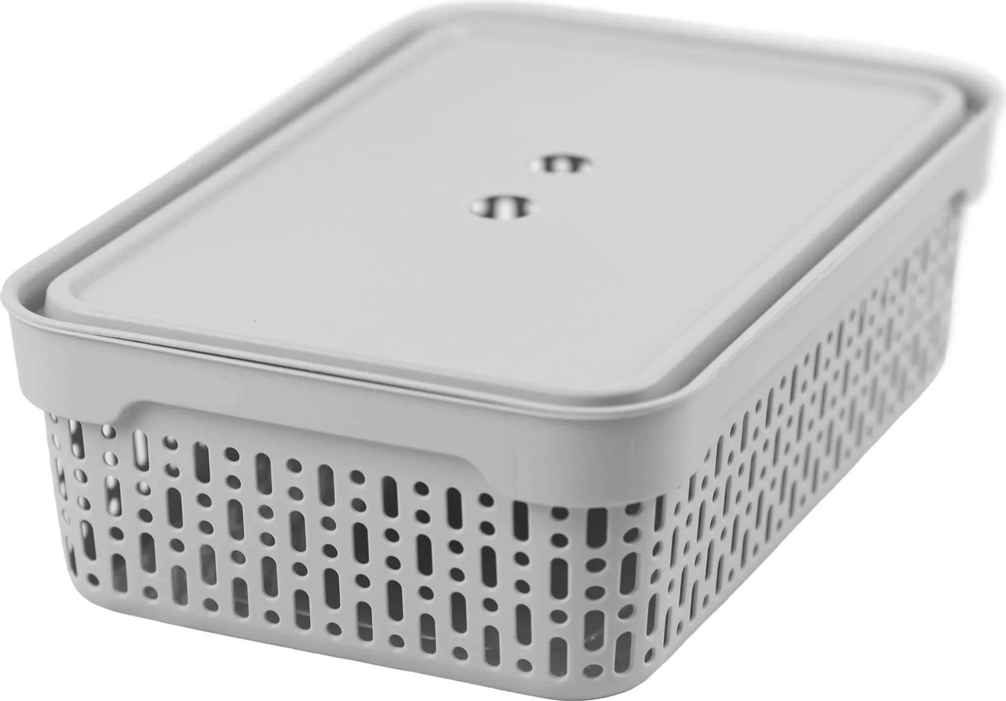 Die perforierten Seitenwände sorgen für eine gute Luftzirkulation und eignen sich ideal zur Aufbewahrung von Kosmetikartikeln, Hygienezubehör oder Textilien. Der mitgelieferte Deckel schützt den Inhalt vor Staub und Schmutz, während seitliche Öffnungen das Tragen und Herausnehmen erleichtern.