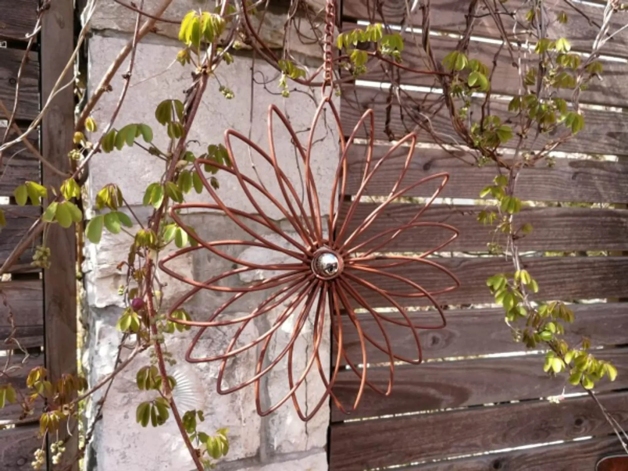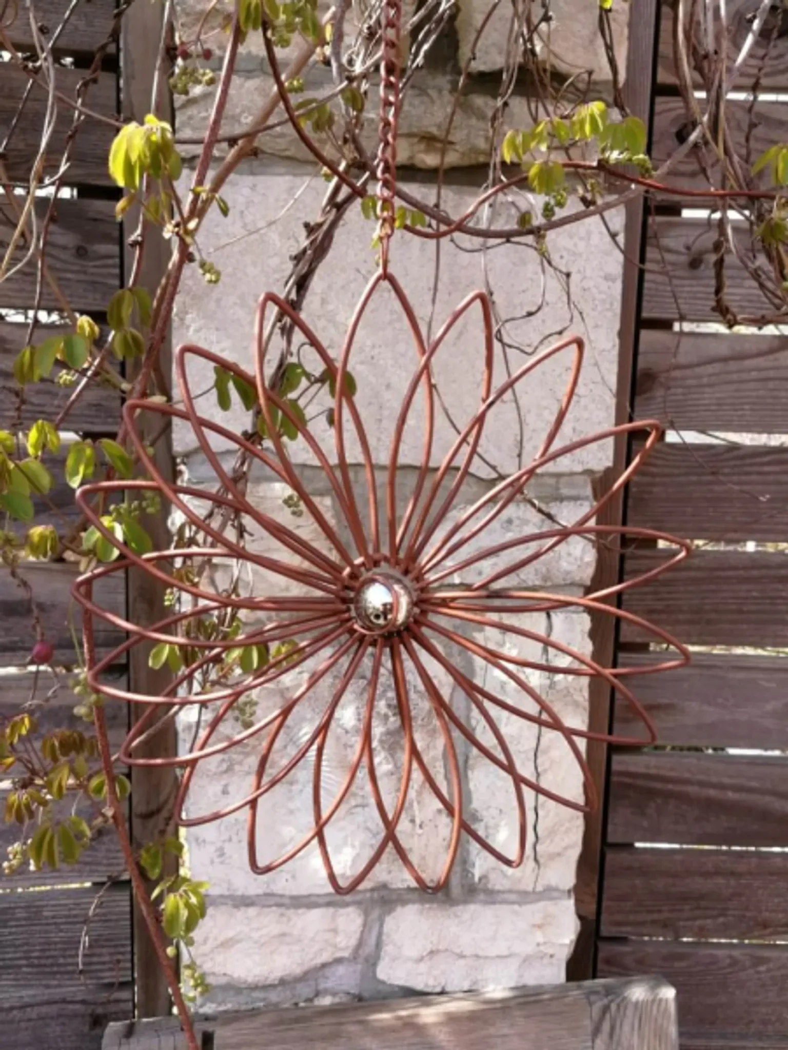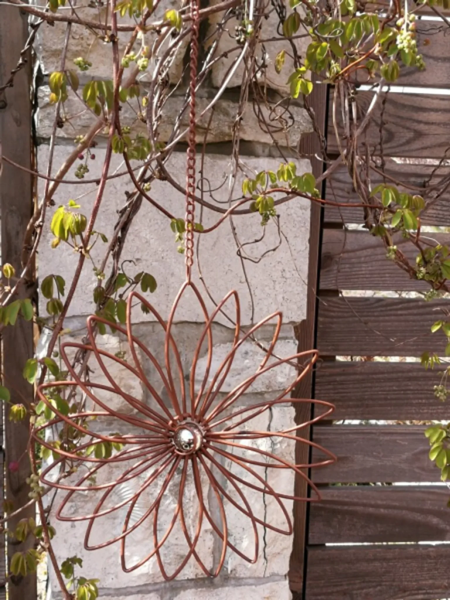 In der Mitte der Blüte befindet sich eine dezente Edelstahlkugel, die einen feinen Kontrast zur warmen Rostfarbe bildet. Dank der bereits montierten Kette mit Haken lässt sich der Hänger sofort an einem Baum, einer Pergola oder einem Wandhaken befestigen.