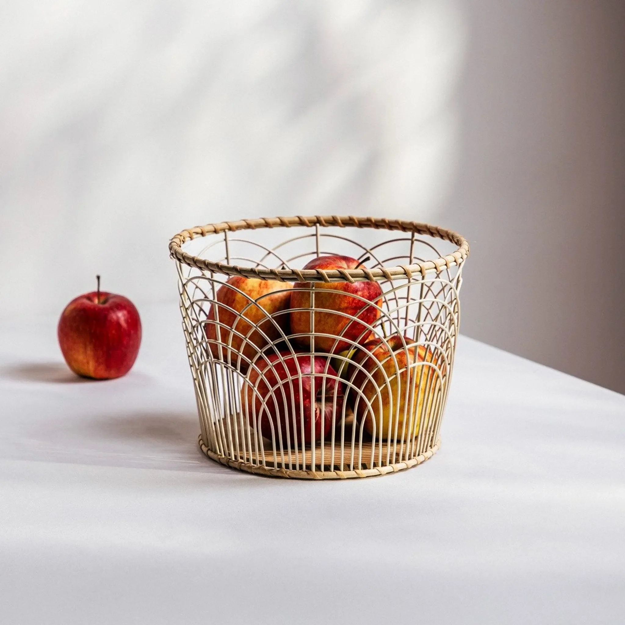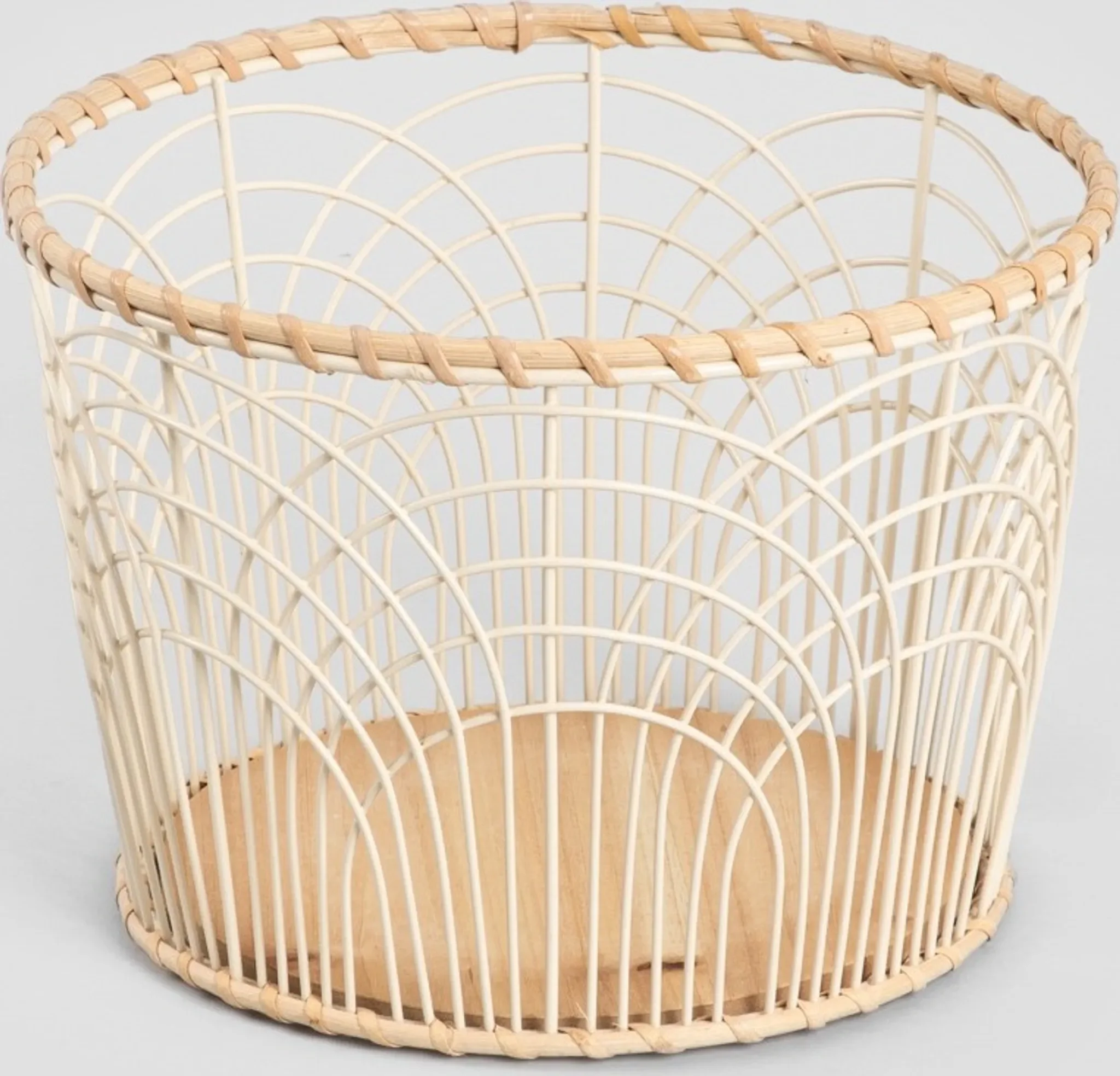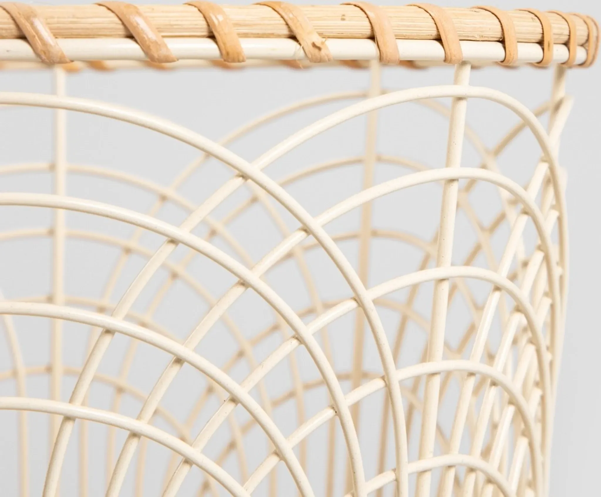 Der Korb „HERON“ vereint funktionale Aufbewahrung mit dekorativer Leichtigkeit. Die filigrane, durchbrochene Metallstruktur in sanftem Cremeton wird durch einen stabilen Holzboden und einen dekorativen Rattanrand ergänzt.
