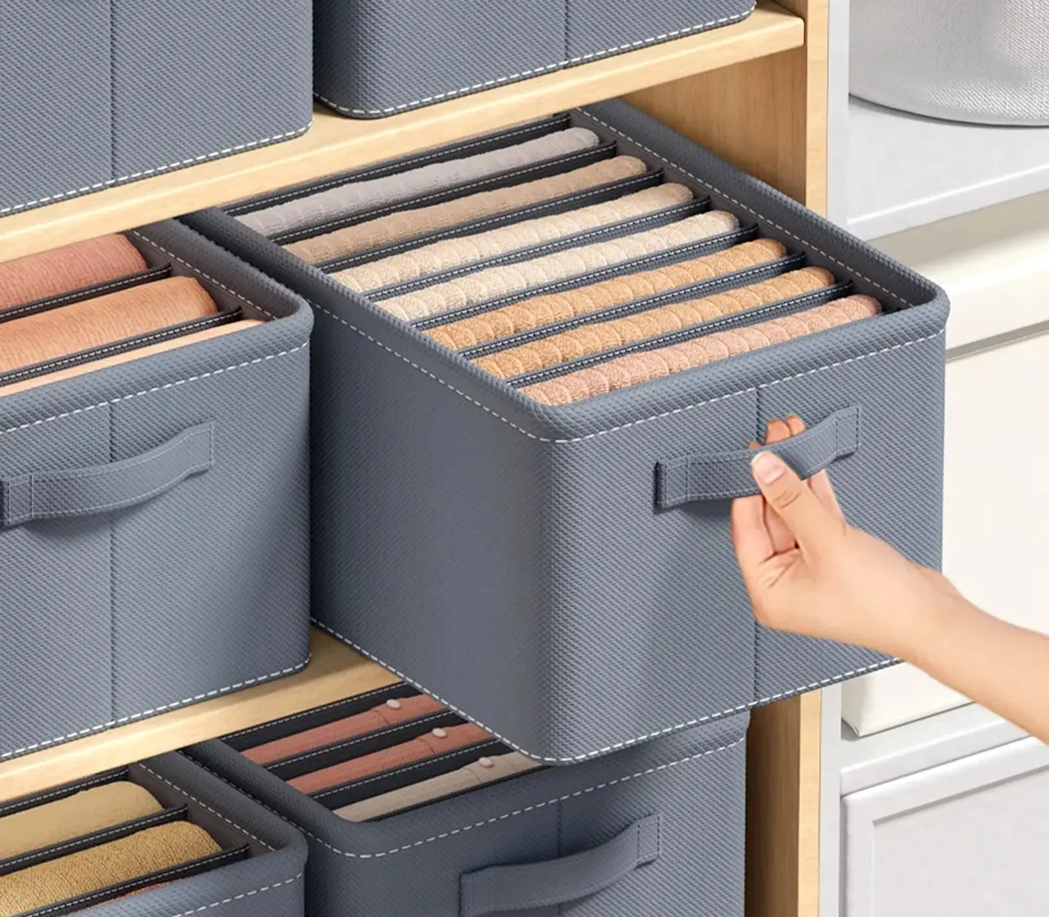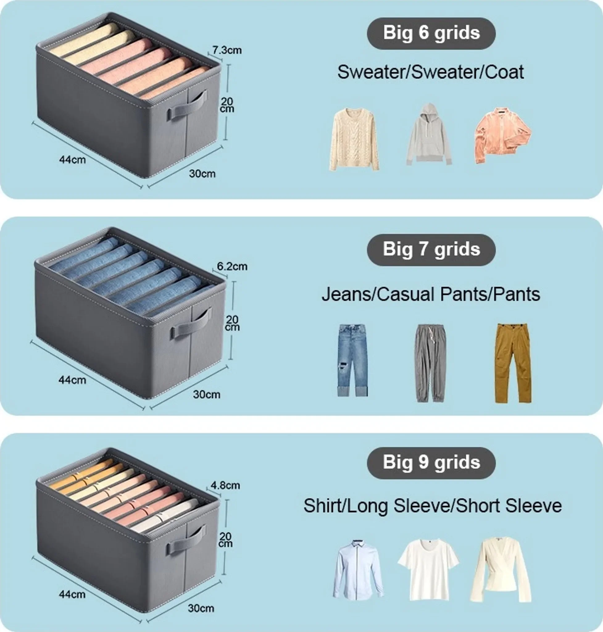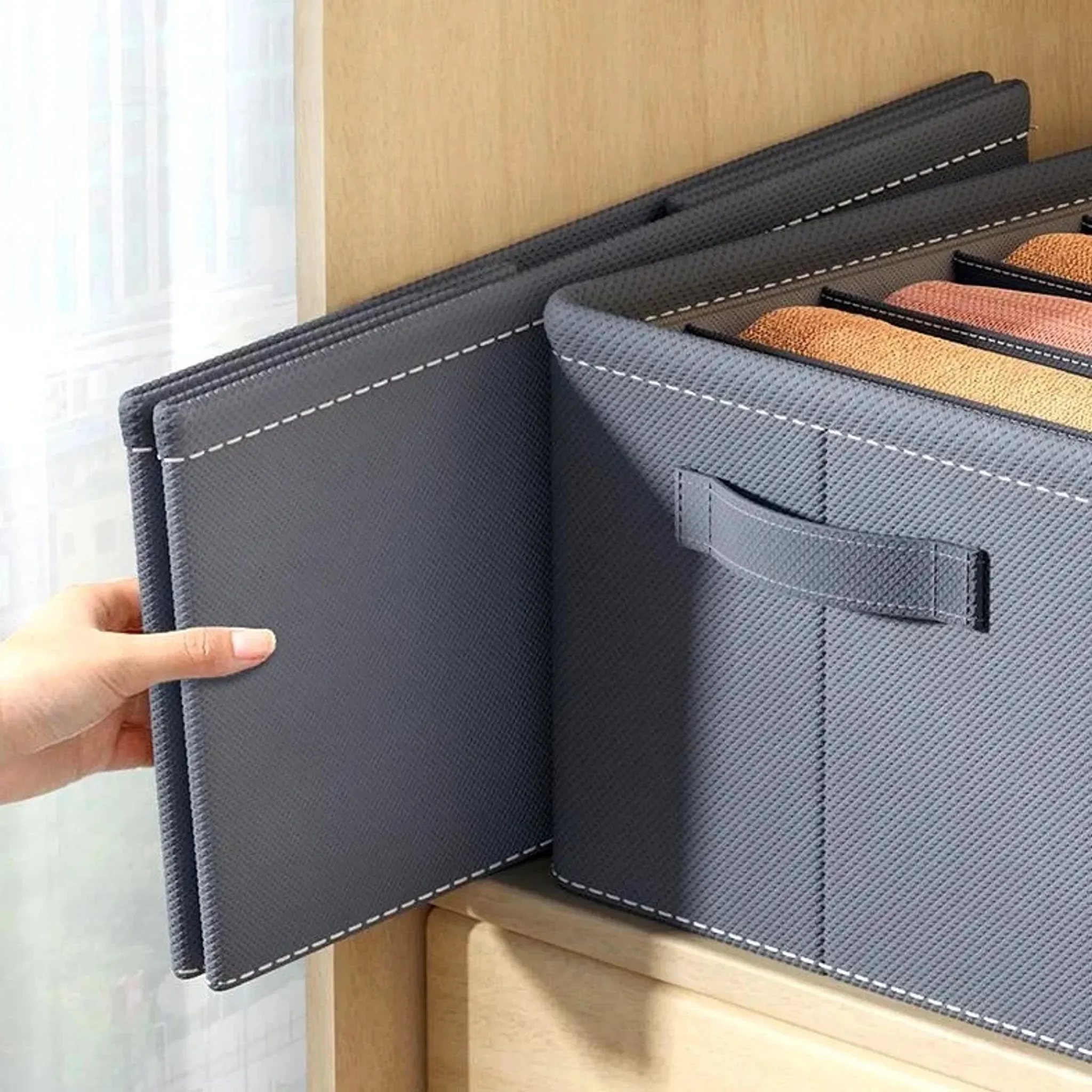 Diese starre Organizerbox bietet eine praktische Lösung zur übersichtlichen Aufbewahrung von Kleidung im Kleiderschrank. Sie eignet sich ideal für Hosen, Sweatshirts, Pullover oder Handtücher und hilft dabei, Ordnung zu schaffen, ohne Kleidungsstücke zu stapeln.