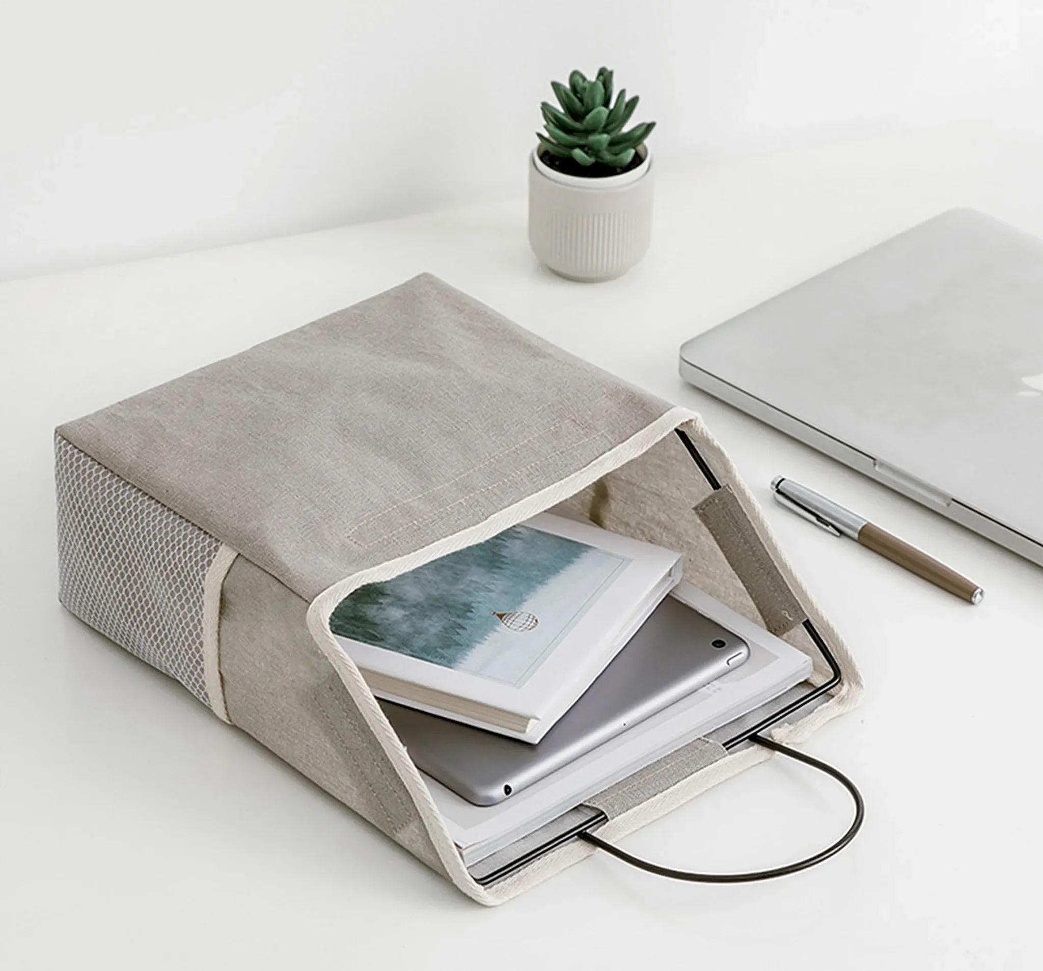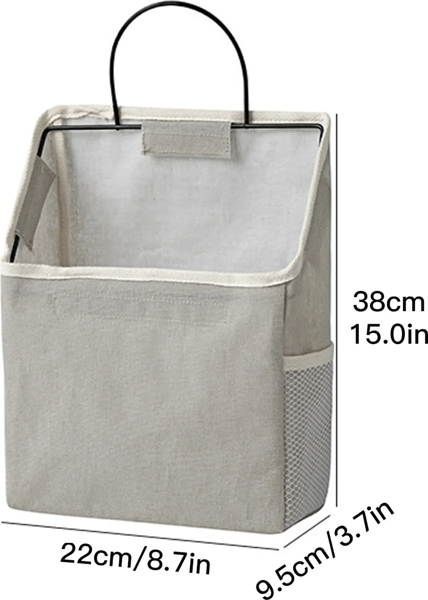 Das robuste Baumwoll-Leinen-Material ist langlebig, atmungsaktiv und pflegeleicht. Ein großzügiges Hauptfach sowie zwei seitliche Netztaschen bieten viel Platz für Bücher, Kosmetik, Spielzeug, Küchenutensilien oder Snacks. Bei Nichtgebrauch lässt sich der Organizer einfach zusammenfalten.