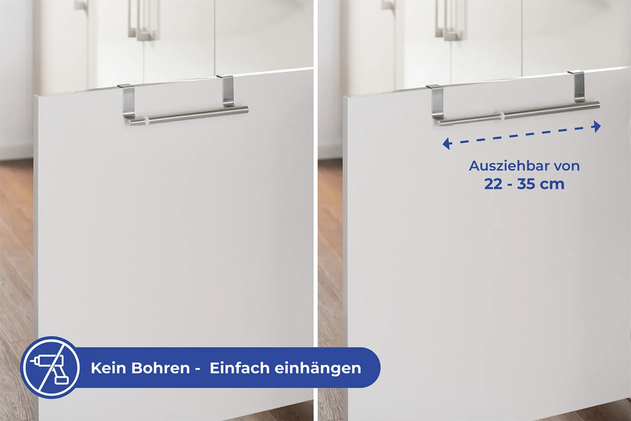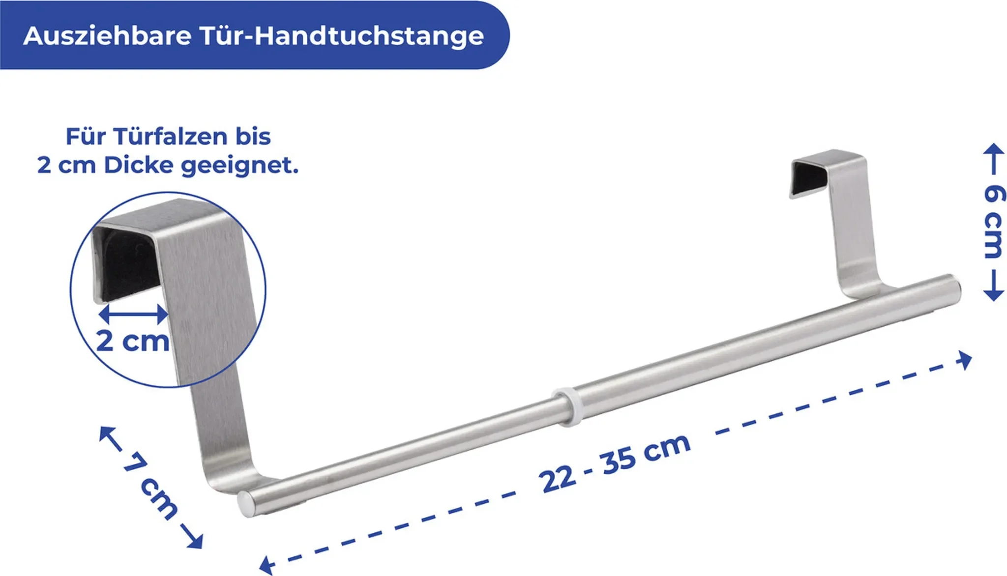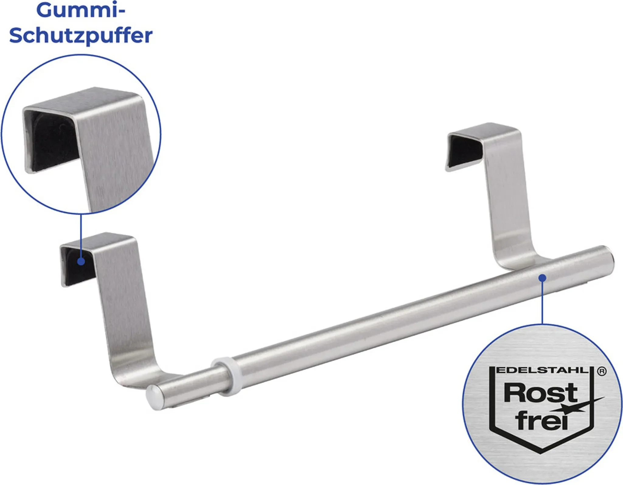 Die teleskopische Tür-Handtuchstange aus rostfreiem Edelstahl schafft schnell zusätzlichen Platz für Hand-, Trocken- oder Putztücher. Dank der ausziehbaren Konstruktion lässt sich die Breite flexibel anpassen und sorgt so für optimalen Halt.